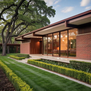 Mixing materials is a defining trait of mid century modern exteriors. Brick, wood, and glass work together to create layered visual interest without unnecessary ornamentation. The flat roof and wide windows keep the structure cohesive despite the varied textures.