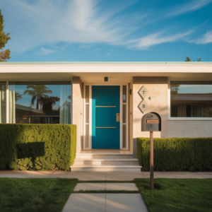 A bold front door instantly transforms a neutral mid century façade. Turquoise, orange, or mustard doors bring personality without overwhelming the clean architecture. Geometric house numbers and retro lighting fixtures add subtle character while maintaining the home’s structured aesthetic.