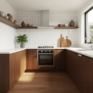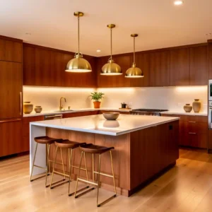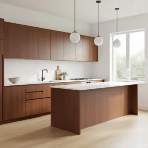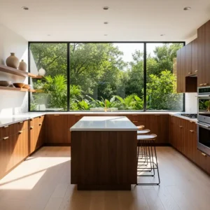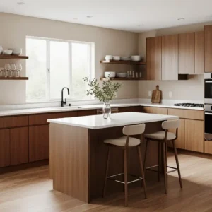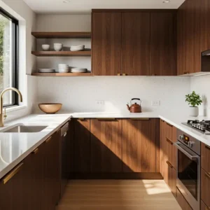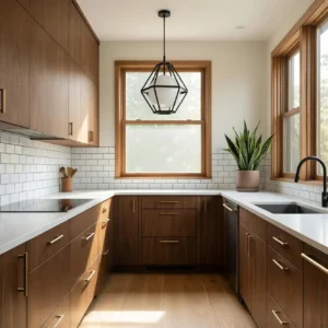 Pair walnut cabinets with white countertops and minimal hardware to keep the space feeling balanced. Add subtle brass accents or modern lighting to enhance the retro aesthetic. This combination creates a welcoming kitchen that feels timeless, stylish, and deeply rooted in mid century design principles.