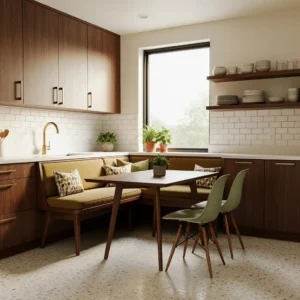 A built-in dining nook adds charm and functionality to mid century kitchens. Simple wooden benches and a compact table create a cozy gathering space within the kitchen itself. This design encourages casual meals and conversation.
