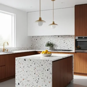 Terrazzo surfaces are making a strong comeback in mid century inspired kitchens. The speckled pattern adds subtle texture and visual interest without overwhelming the design. Its durability also makes it ideal for busy kitchens.
