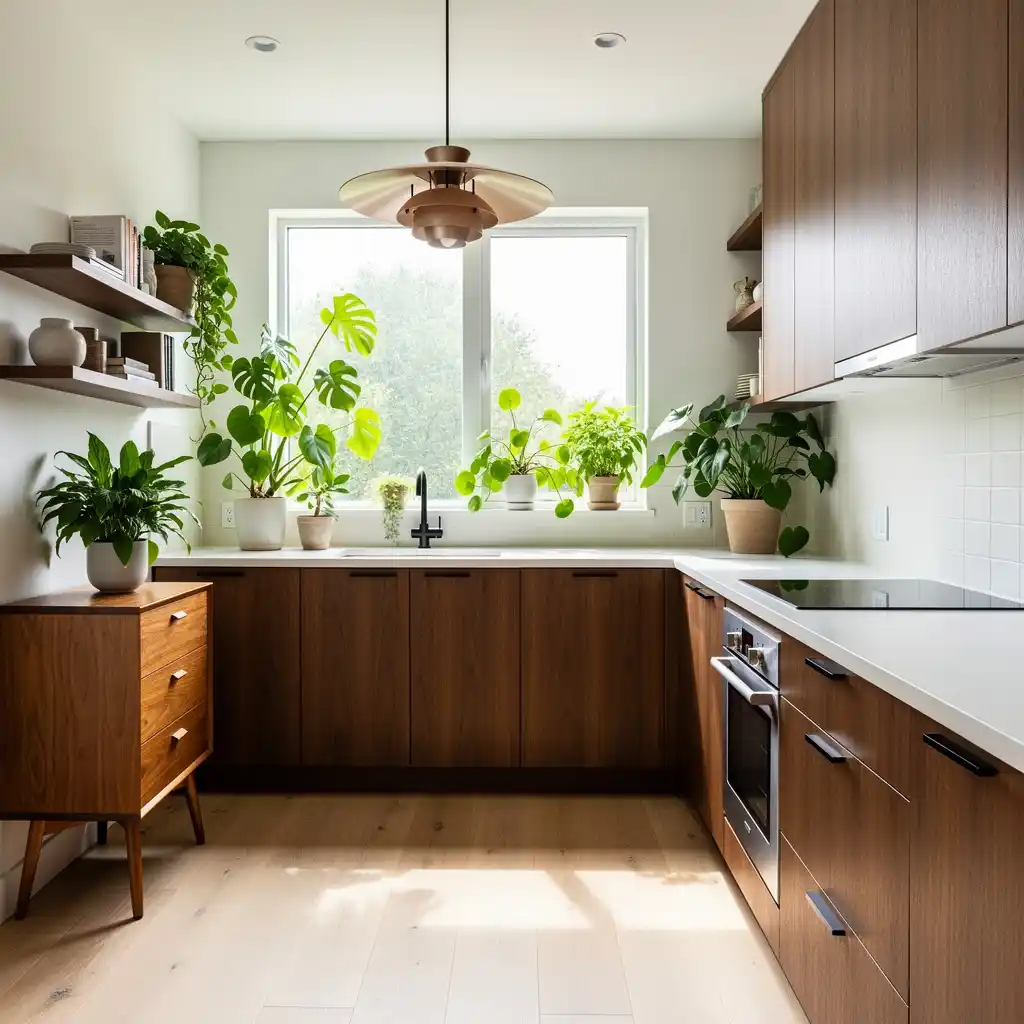 Plants add life and freshness to mid century modern kitchens. Their organic shapes contrast beautifully with the clean lines of cabinetry and furniture. Even a few potted herbs or leafy plants can transform the atmosphere.