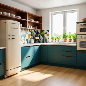 Balance colorful appliances with neutral cabinetry and simple countertops. This contrast keeps the space feeling modern rather than overly themed. The result is a kitchen that celebrates retro design while remaining practical and stylish.