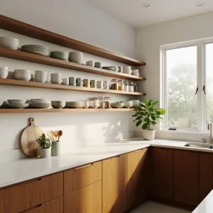 Open shelving is both practical and stylish in a mid century modern kitchen. Wooden shelves allow everyday items like dishes and glassware to become part of the décor. This design choice keeps the space feeling open and airy while highlighting beautiful materials.
