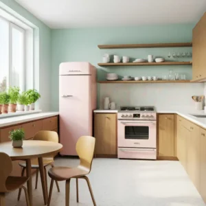 Vintage-inspired appliances bring nostalgic charm to a mid century kitchen. Rounded edges and pastel colors reflect the playful design spirit of the 1950s and 1960s. These appliances instantly become eye-catching focal points.
