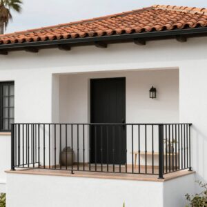 Black metal accents offer a modern contrast to traditional Mediterranean elements. Railings, light fixtures, and window frames in matte black add sleek definition against soft stucco.