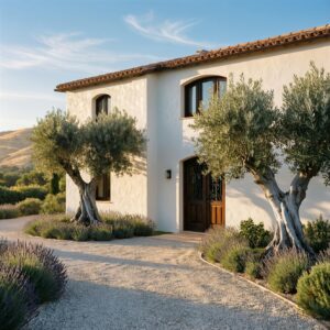 Simple landscaping enhances the beauty of Mediterranean homes. Olive trees, gravel pathways, and low shrubs create an organic, low-maintenance setting. The minimal approach keeps the focus on architecture.
