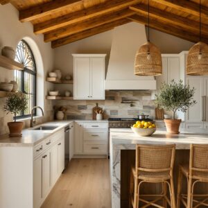 A Mediterranean-inspired kitchen blends clean white cabinetry with natural stone and wood accents. The look feels bright yet grounded, emphasizing simplicity and craftsmanship.