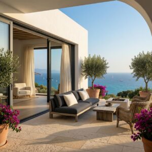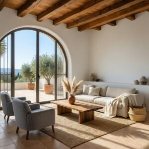 Furnish both areas with cohesive neutral palettes to maintain continuity. Add woven textures and soft cushions for comfort. The transition between interior and exterior spaces creates a resort-like feel that perfectly captures the Mediterranean lifestyle.