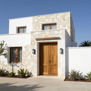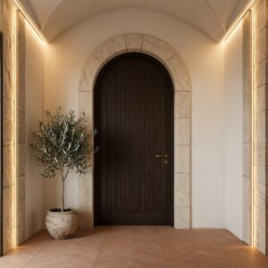 A grand wooden front door makes a powerful first impression. Rich wood tones add warmth and authenticity to modern Mediterranean exteriors. When framed by an arch or stone detailing, the entrance feels inviting and elegant.