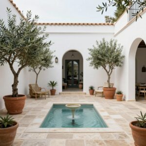 Courtyards are a classic Mediterranean feature that feel especially luxurious in modern homes. Enclosed outdoor spaces with stone flooring and simple fountains create a private retreat for relaxation and entertaining.