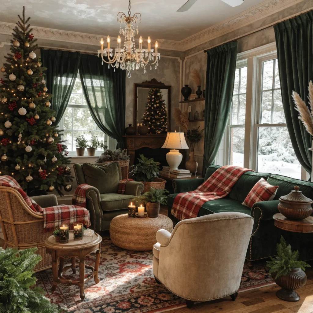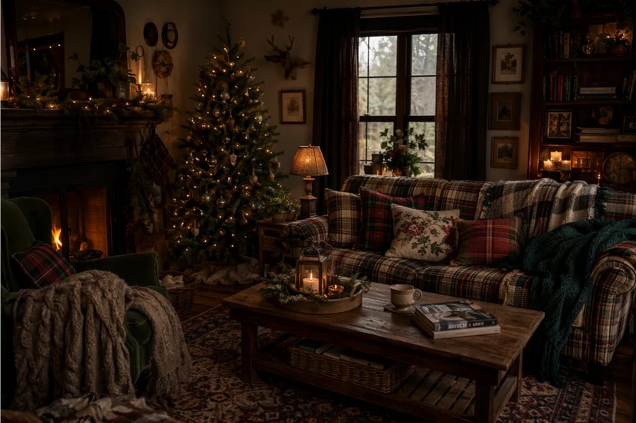 Plaid textiles instantly evoke winter comfort and holiday nostalgia. Choose deep reds, greens, and browns for a cohesive moody palette. Blankets and cushions add warmth and visual texture.