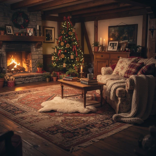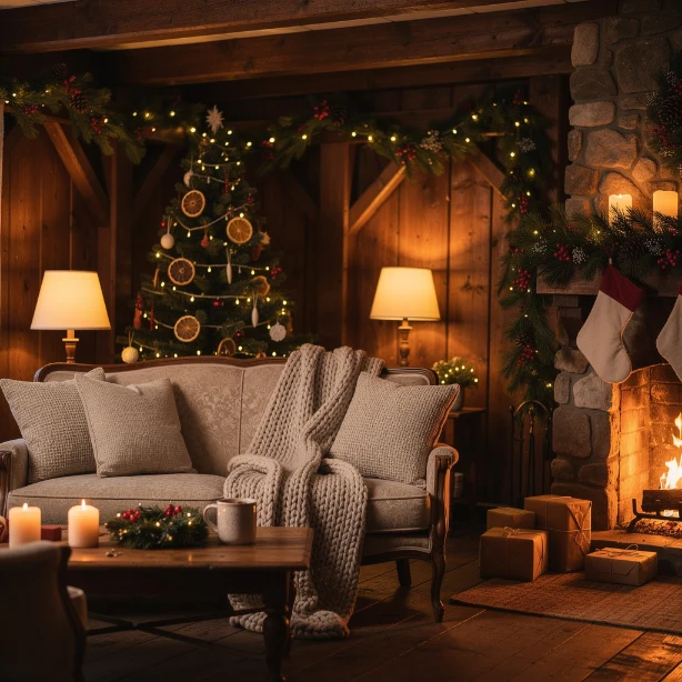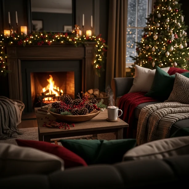 Decorate the mantel with garlands, pinecones, and stockings for a festive touch. The layered lighting makes the room feel warm and magical during cold winter nights.