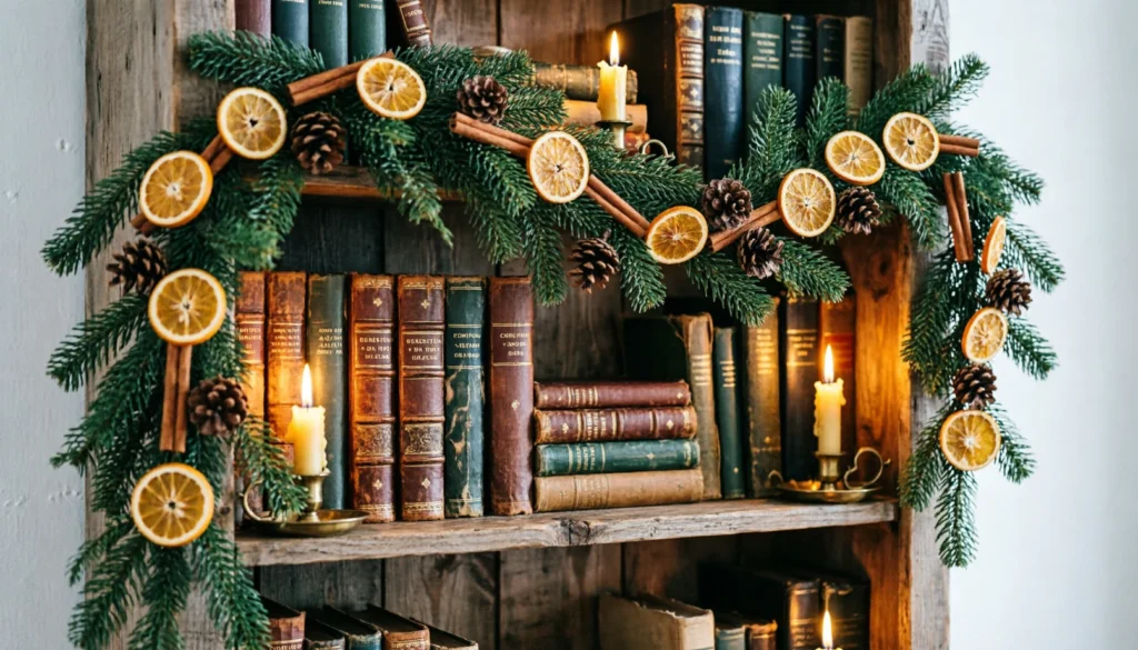 Decorate bookshelves with garlands, candles, and ornaments. Mix holiday decor with everyday items for a lived-in feel. This styling feels cozy and authentic.