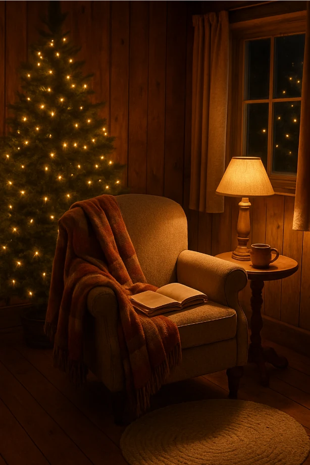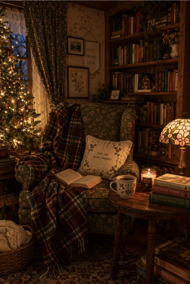 Create a reading nook with a comfy armchair and soft lighting. Place near the tree for a magical glow. Add blankets and cushions for comfort.