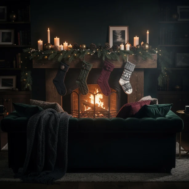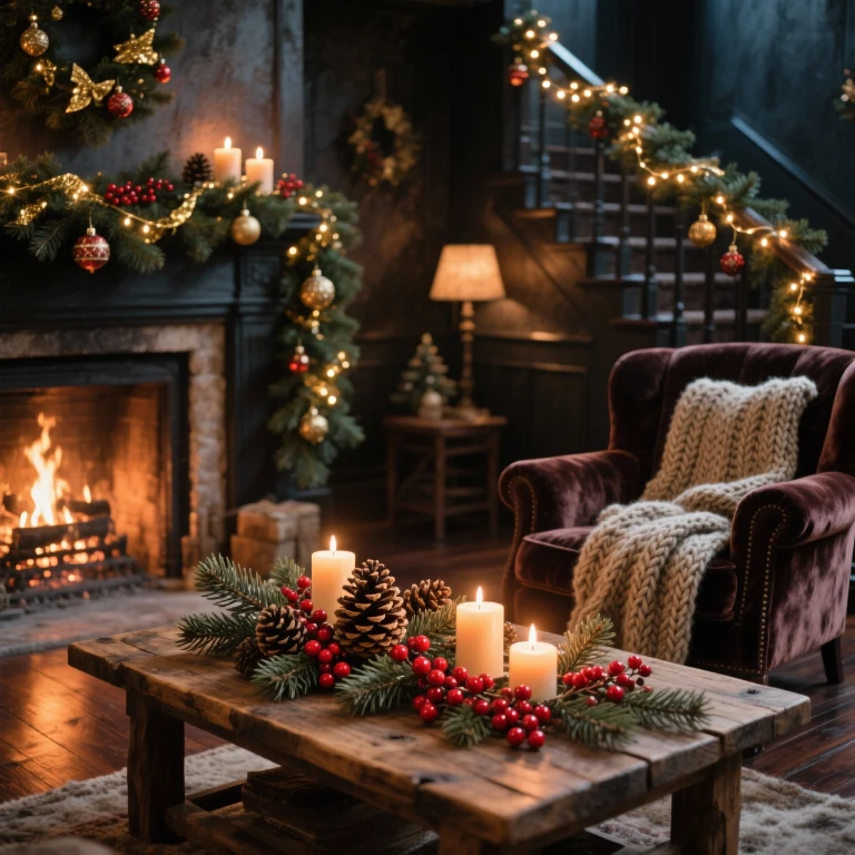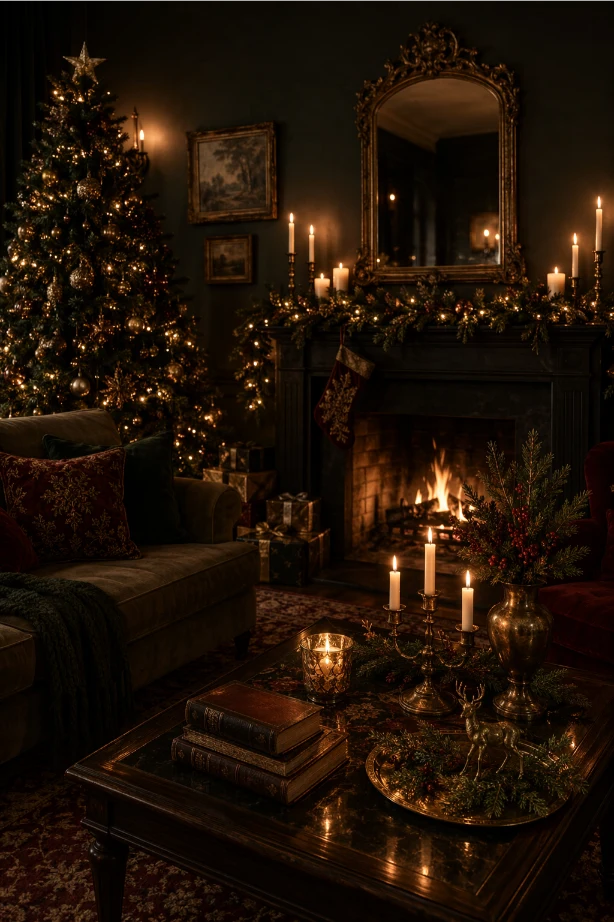 Add warm fairy lights, candles, and a glowing Christmas tree to brighten the darker palette. The contrast between darkness and sparkle creates an enchanting holiday ambiance that feels magical and inviting.
