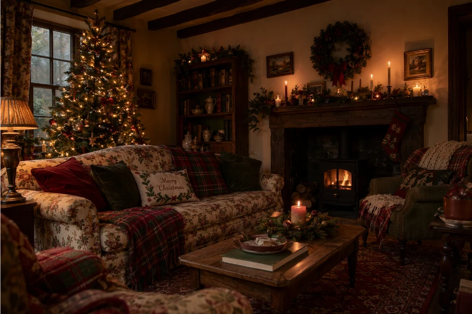 A vintage floral sofa adds romantic cottagecore charm to a dark living room. Choose muted florals in deep reds, greens, or browns to match the Christmas palette. The pattern brings softness and nostalgia into the moody space.