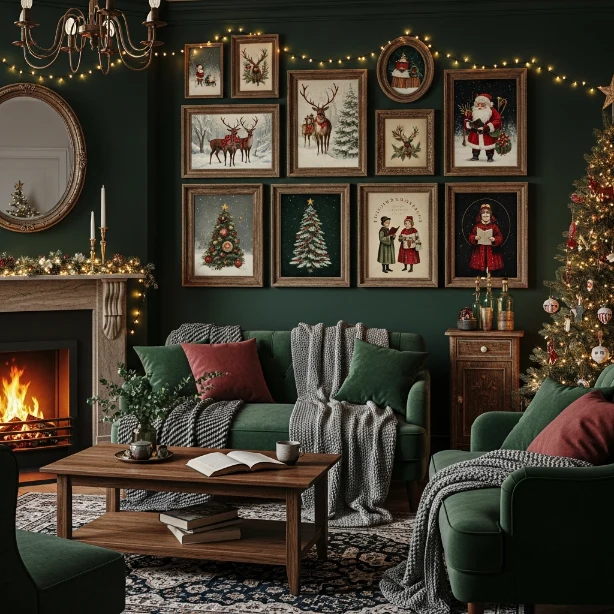 A gallery wall filled with vintage frames creates visual interest. Add winter landscapes, botanical prints, and holiday artwork for a seasonal twist. Dark frames enhance the moody aesthetic.