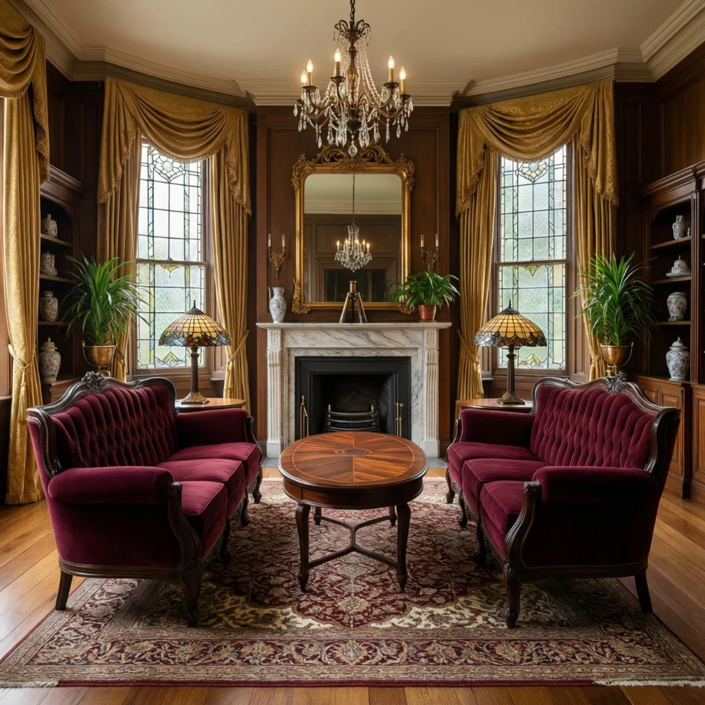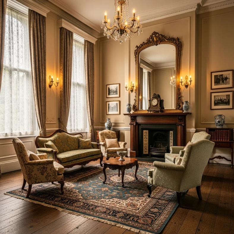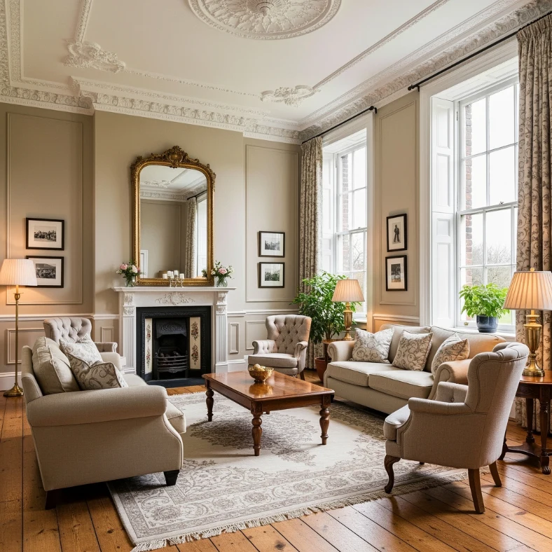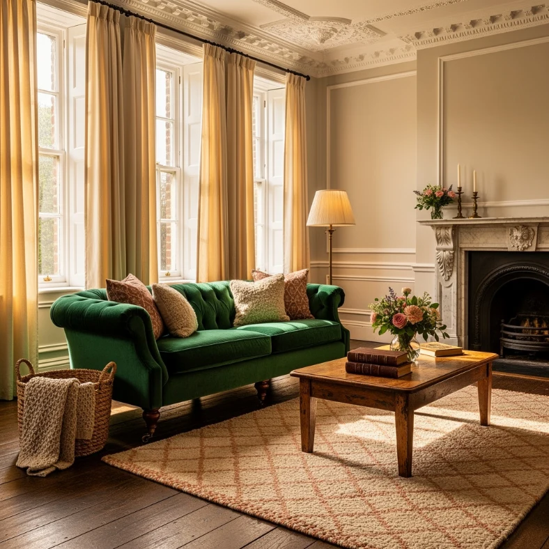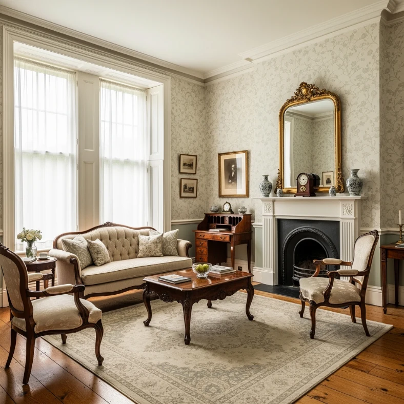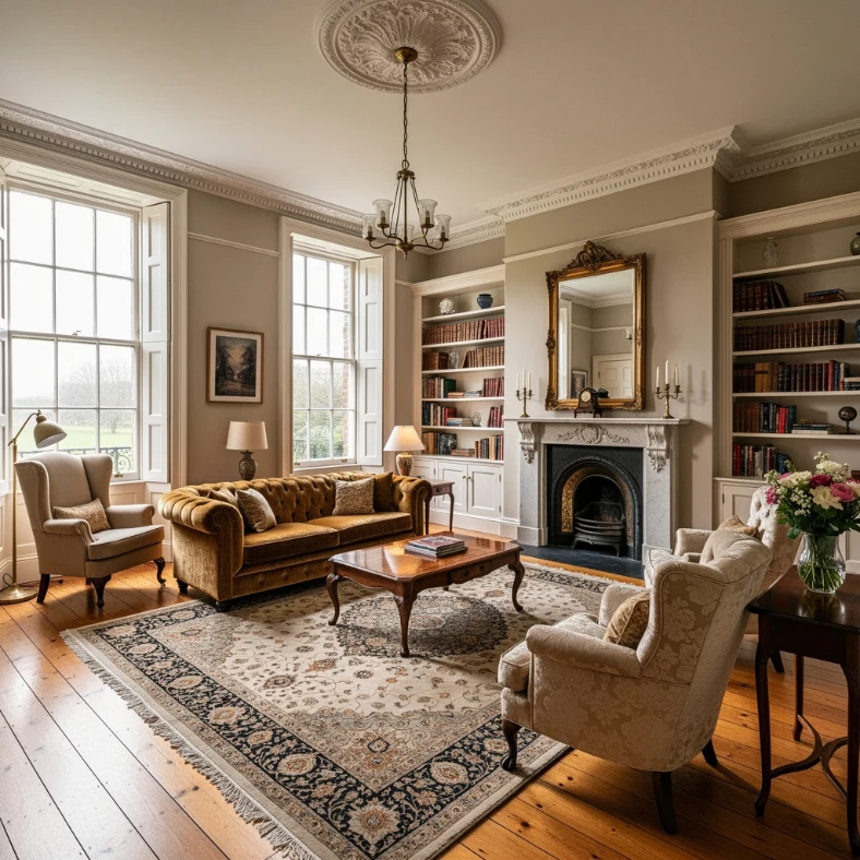 A vintage rug can anchor the seating area while adding warmth and character. Persian or oriental designs work particularly well in Edwardian interiors, complementing the classic aesthetic. Rugs help define zones without the need for additional furniture.