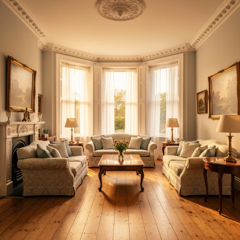 Bay windows are a defining feature of Edwardian interiors and play a major role in creating openness. Allowing natural light to flood the room enhances both brightness and perceived space. Sheer drapes maintain privacy while preserving the light, giving the room an airy and serene quality.