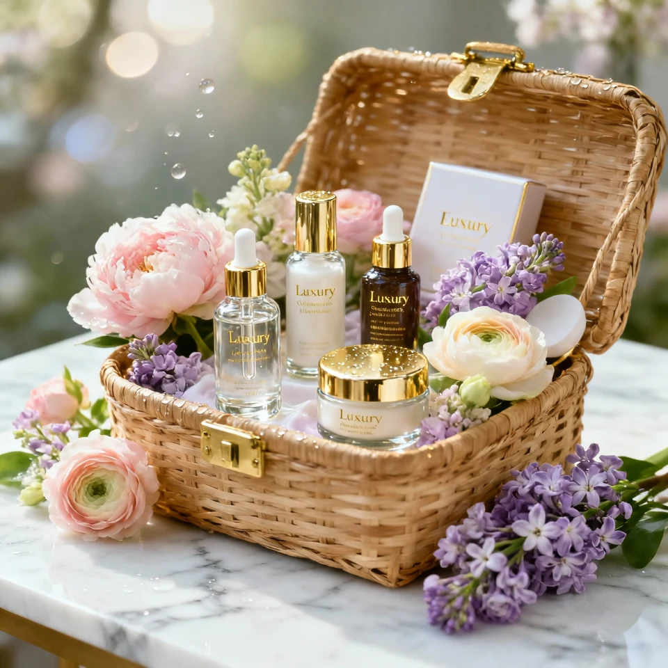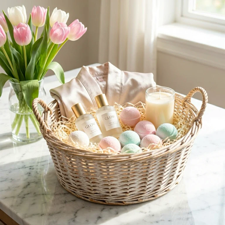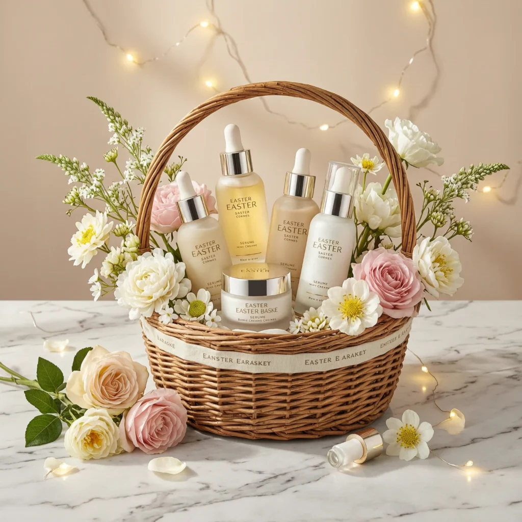 A skincare basket feels luxurious and self-care focused. Include serums, creams, and beauty tools for a premium touch.
