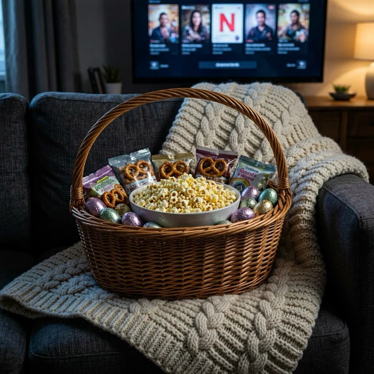 Create a cozy movie night basket with popcorn, snacks, and a blanket.