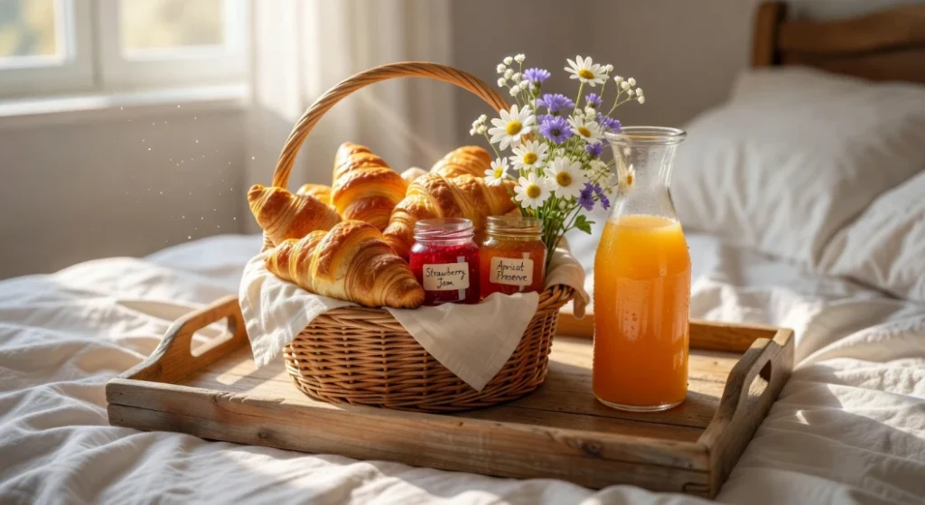 Fill a basket with breakfast goodies like pastries, jams, and juice.