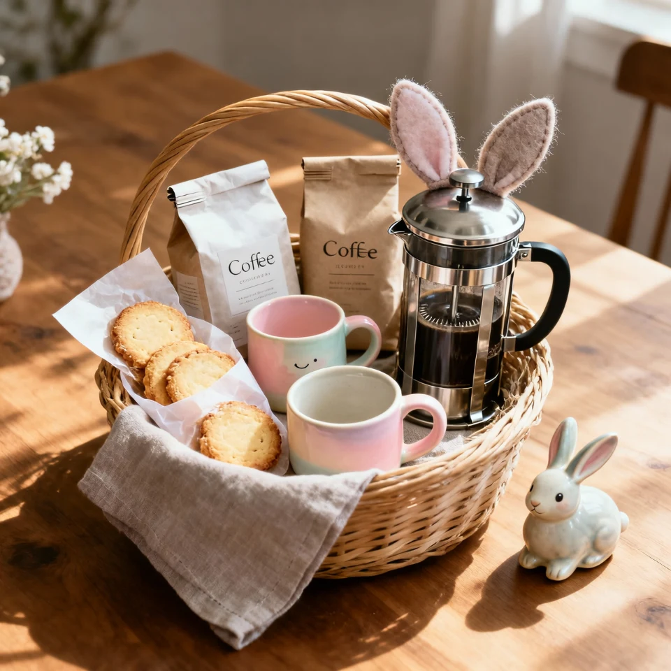 Create a cozy coffee-themed basket for moms who love their daily brew. Include gourmet coffee beans, flavored syrups, a stylish mug, and sweet treats like biscotti. This setup makes mornings feel special and comforting, especially when styled in soft neutral or spring tones.