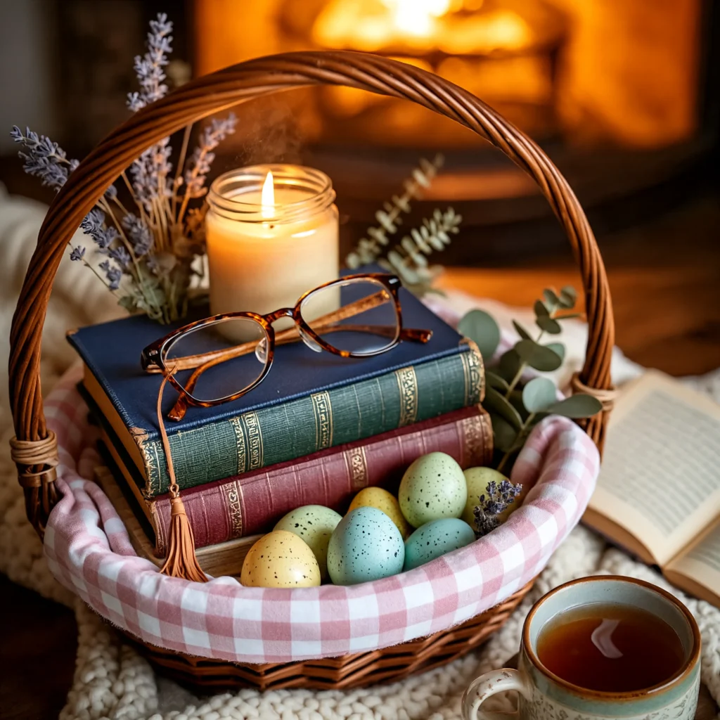 A book-themed basket is perfect for moms who love reading. Add a novel, bookmark, and a candle to create a cozy vibe.