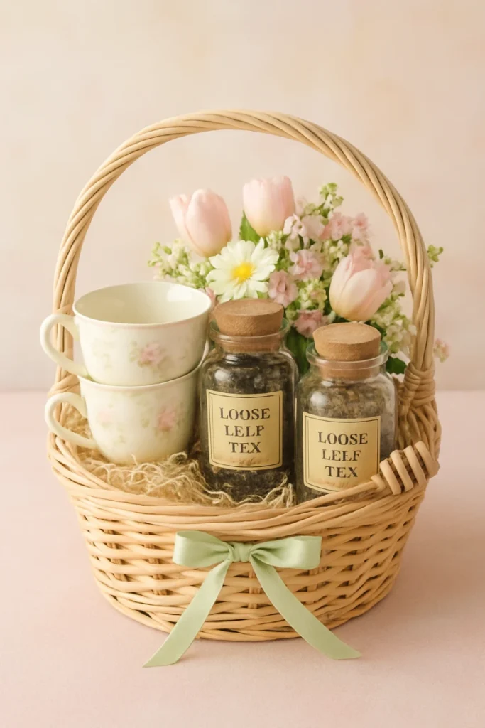 Tea baskets feel calming and cozy. Include herbal blends, honey sticks, and biscuits.