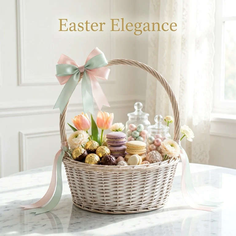 This basket is pure happiness for anyone with a sweet tooth. Fill it with gourmet chocolates, macarons, caramel popcorn, and chocolate-covered strawberries. Mix textures and colors so the basket feels abundant and exciting. A few pastel ribbons or mini bunny decorations make the theme feel festive and perfect for Easter gifting.