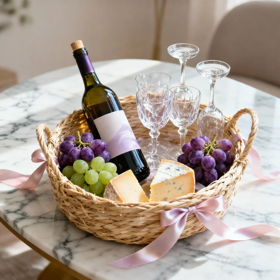 A wine basket feels classy and celebratory. Add wine glasses, cheese, and chocolates. Choose elegant packaging.