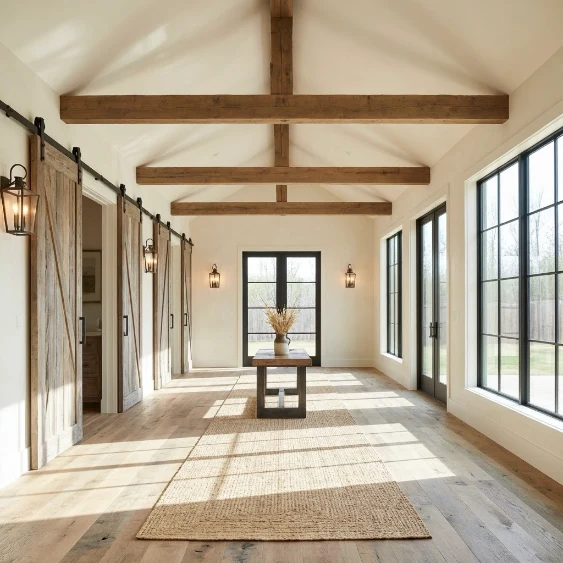 Pair beams with soft wall colors and warm lighting to enhance coziness. Avoid overcrowding the space with décor. This design creates a strong farmhouse identity while maintaining openness.