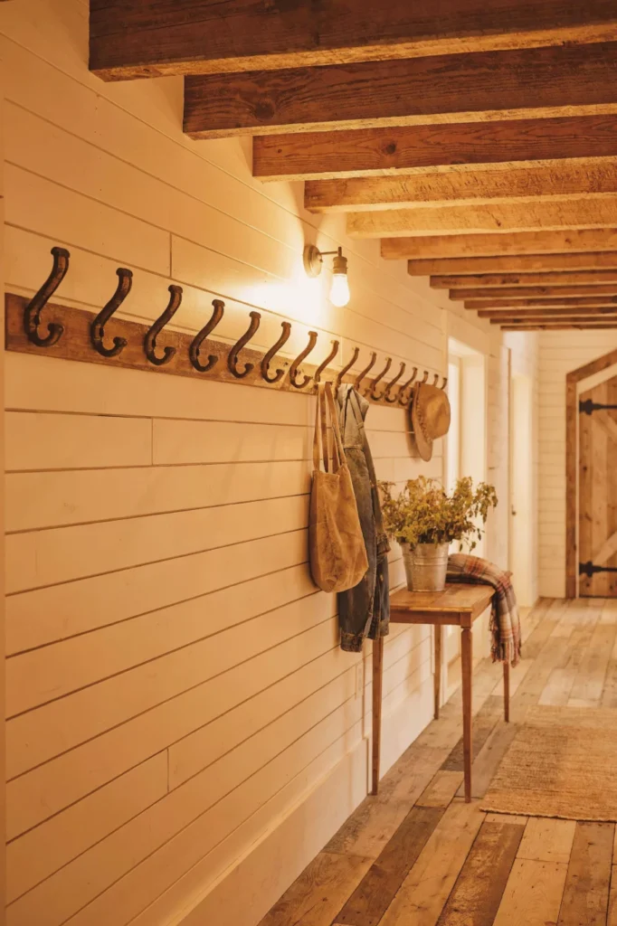 Pair the wood walls with soft neutral flooring and simple black metal lighting for contrast. Keep décor minimal so the natural grain remains the focal point. This combination creates a rustic yet refined hallway that feels both functional and inviting.