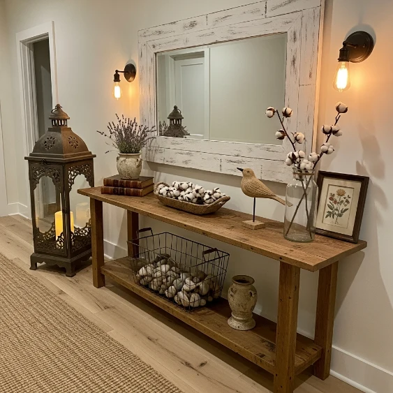 A rustic console table adds both function and charm to hallway spaces. It provides a surface for décor, storage baskets, or lighting accents. In barndominiums, reclaimed wood tables work especially well.