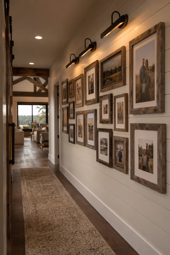 A gallery wall transforms a simple hallway into a personal storytelling space. Framed family photos, vintage artwork, or countryside prints add warmth and personality to otherwise unused walls. In a barndominium, this feature enhances the home’s lived-in, rustic character.