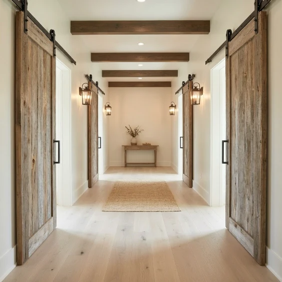 Use them to separate rooms or storage areas without sacrificing flow. Keep surrounding walls simple so the doors remain the focal point. This blend of function and style enhances the hallway’s farmhouse charm.