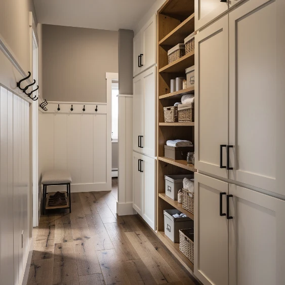 Built-in storage helps keep hallways tidy while maintaining a cozy aesthetic. Cabinets or open shelves integrated into the wall provide space for décor, baskets, or everyday essentials. This keeps clutter off the floor and maintains visual flow.
