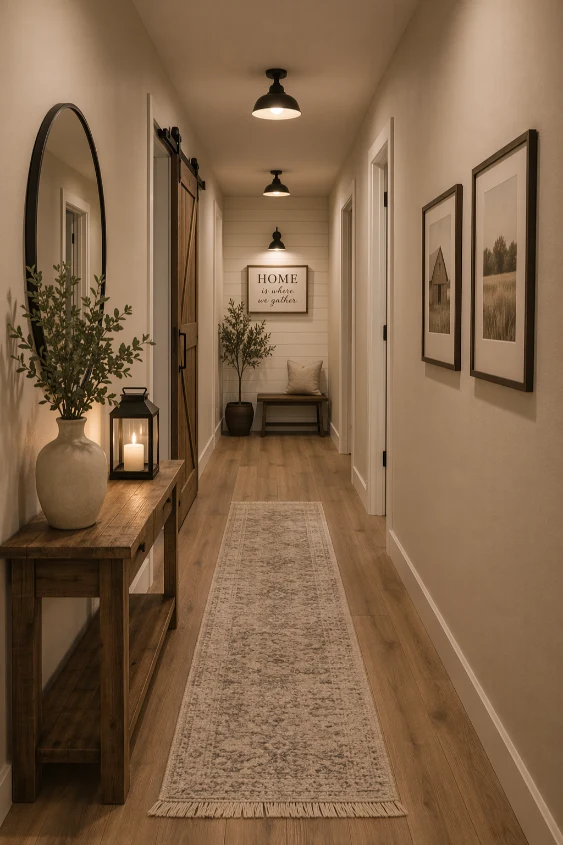 Soft ambient lighting transforms a hallway into a warm and inviting space. Instead of harsh overhead lights, use layered lighting such as sconces or recessed fixtures. This creates a relaxed atmosphere.