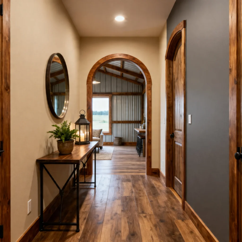 Arched entryways soften the straight lines of a hallway and add subtle architectural interest. In a barndominium, arches create a blend of rustic and elegant design that feels both cozy and unique.