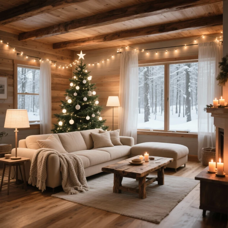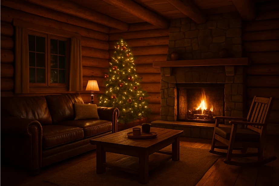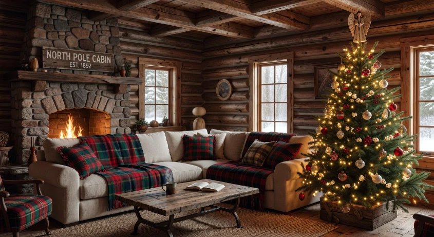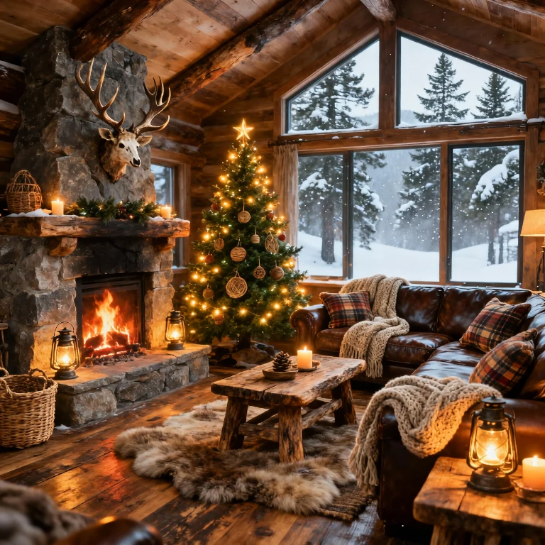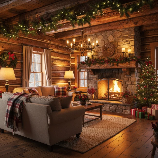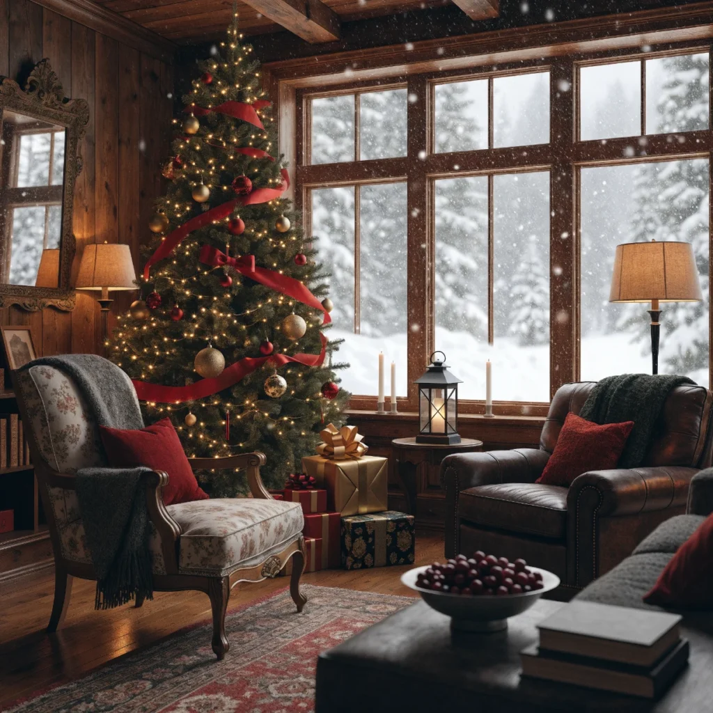 Choose neutral tones with subtle holiday accents for balance. This cozy setup encourages relaxation and long evenings by the fire, perfect for Christmas in the mountains.
