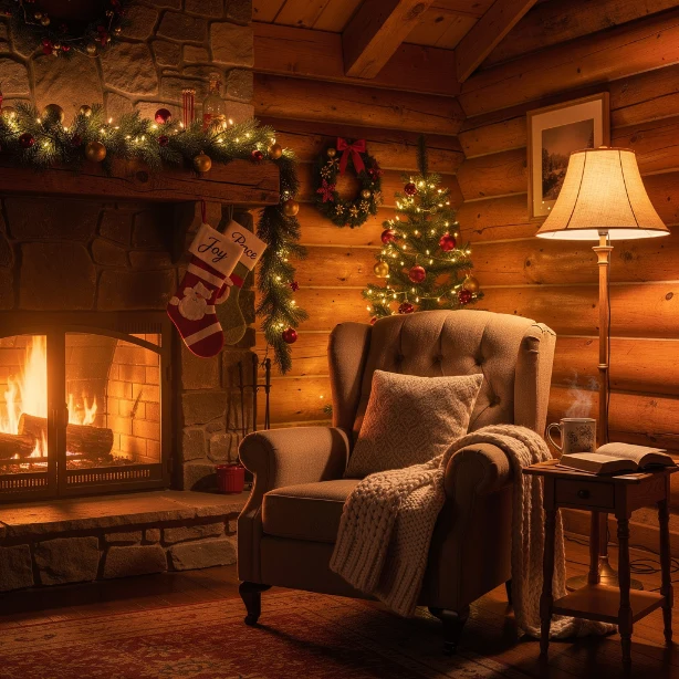 Keep the area softly lit and decorated with subtle holiday accents. This cozy corner invites relaxation and festive comfort.