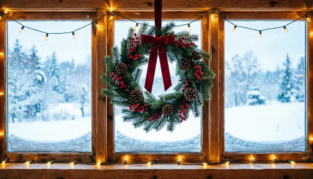 Decorating windows with wreaths and lights frames beautiful winter views. The glow from inside adds warmth against snowy scenery.