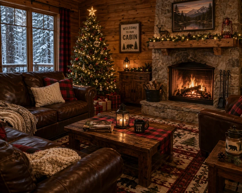 Leather and wood furniture create a classic lodge aesthetic. Rich textures add warmth and durability while complementing holiday décor.