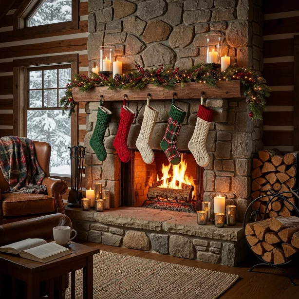 Layer plush seating nearby so everyone can gather around the fire. Add cozy throws and chunky knit pillows for comfort. The crackling fireplace glow paired with holiday décor creates a magical, welcoming mountain lodge atmosphere.