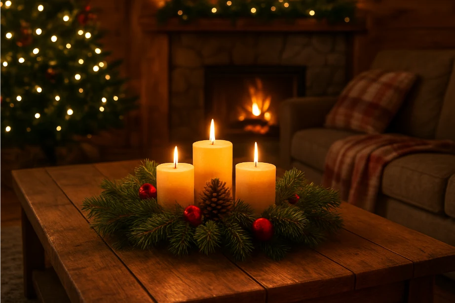 A rustic wooden coffee table provides the perfect base for festive décor. Arrange candles, pine branches, and ornaments to create a simple yet elegant centerpiece.