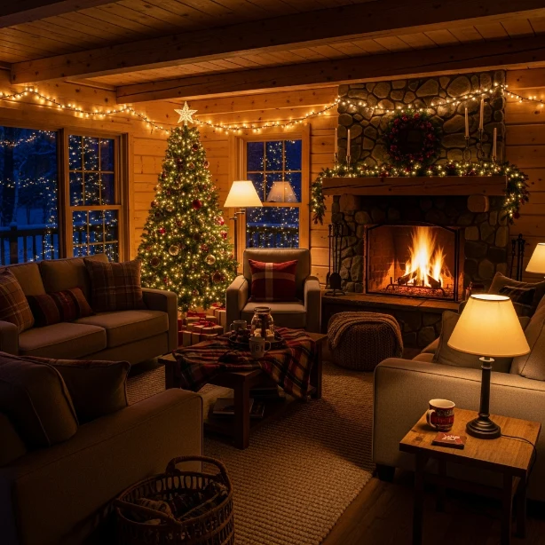 Avoid harsh overhead lighting to maintain warmth. The gentle illumination enhances holiday décor and makes the room feel welcoming and intimate.