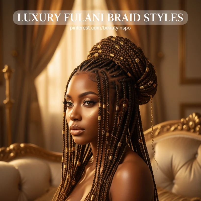 Gold cuffs instantly transform Fulani braids into a luxurious hairstyle. The metallic shine contrasts beautifully with dark braids, creating a glamorous and regal appearance. Placing cuffs along the center braid or randomly across the hair adds sparkle and visual interest without overwhelming the style.
