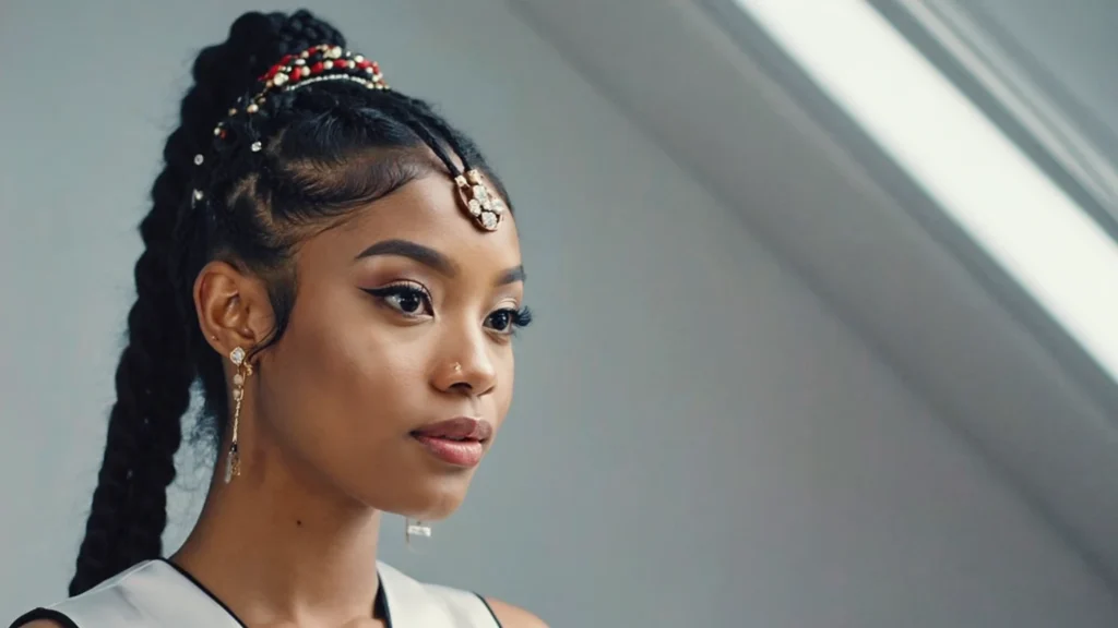 A high ponytail transforms Fulani braids into a sporty yet chic hairstyle. Gathering braids into a ponytail adds volume and height while showing off length and bead details. The lifted style feels energetic and modern.