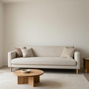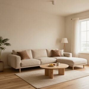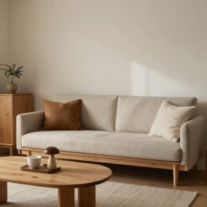 Image Prompt: Japandi living space in mushroom tones, neutral sofa, wooden furniture, soft natural lighting, minimalist decor